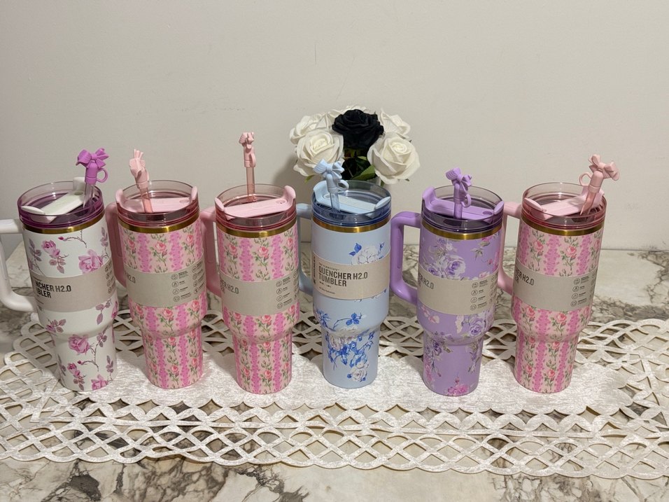 Pastel renklerde, çiçek desenli büyük boy termos. Üzerinde "ENCHERH20" etiketi bulunur ve kullanımı kolay bir kulpludur.