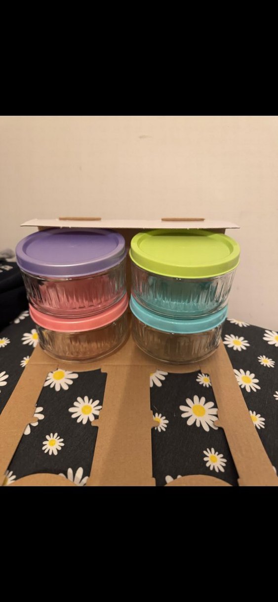 Mor, yeşil, pembe ve mavi pastel renkli kapaklı dört adet cam saklama kabı. Her biri kabartmalı tasarıma ve hava geçirmez kapaklara sahiptir.
