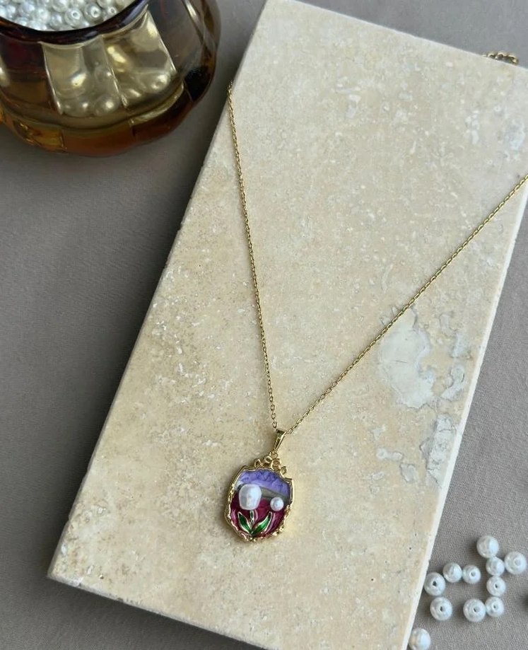 Pastel Renkli Çiçek Desenli Altın Kolye