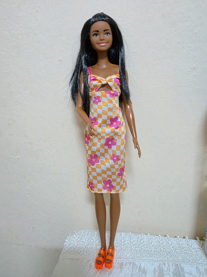 Uzun siyah saçlı, pastel renkli kareli çiçek desenli elbise ve turuncu ayakkabılı bebek.