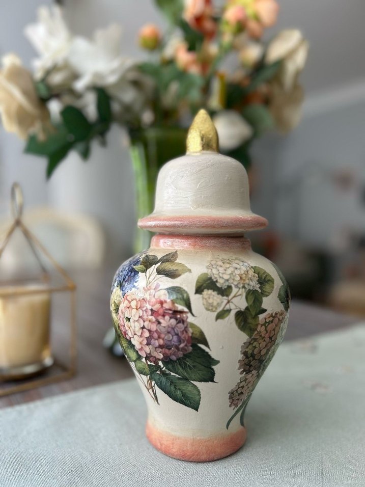 Pastel renkli çiçek desenleri, pembe taban ve altın uçlu kapağıyla beyaz vazo, mekana zarif bir dokunuş katar.