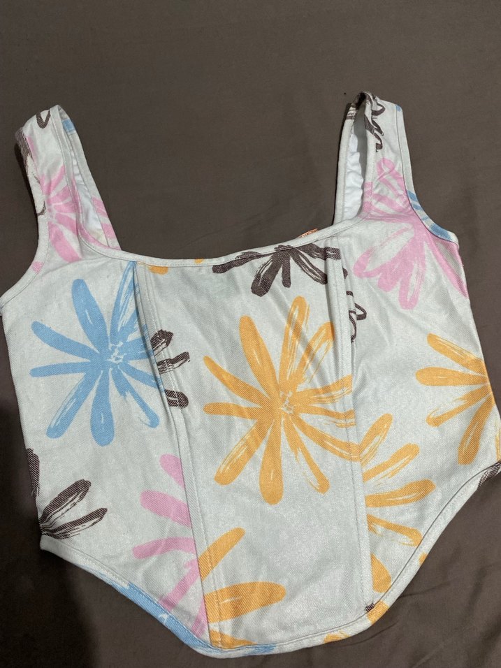Pastel renkli çiçek desenlerine sahip, fermuarlı, normal boyda ve vücuda oturan bustiyer. Sokak stiline uygun rahat bir parça.