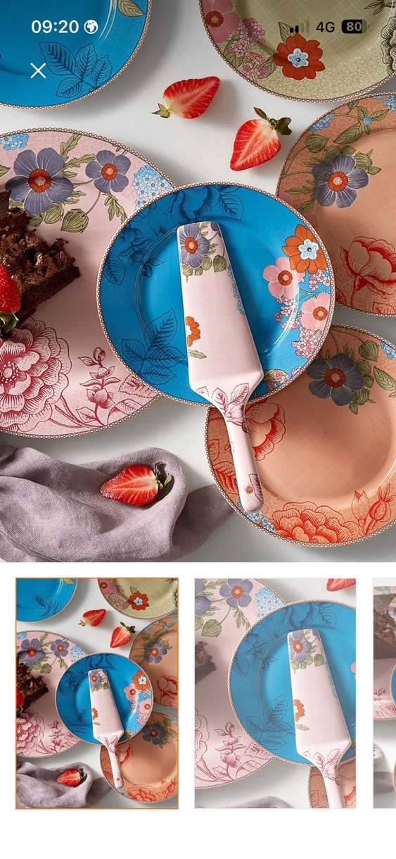 Pastel renklerde, çiçek desenli pasta tabakları ve uyumlu pasta spatulası içeren set. 1 kez kullanıldı. Sıfırdan farksız