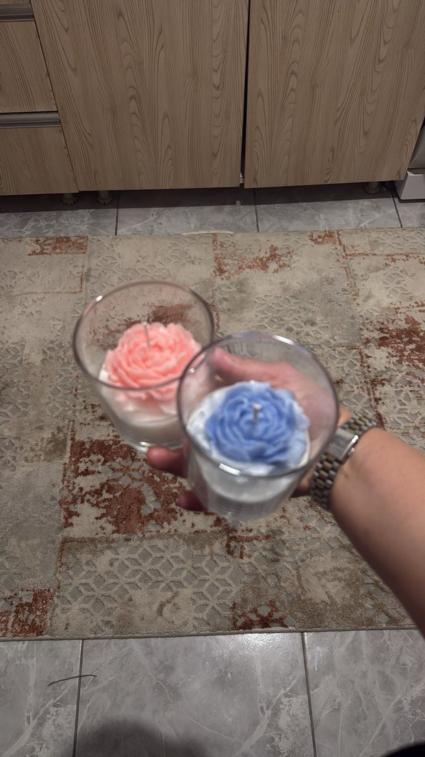 Pastel renklerde, cam içinde çiçek şeklinde mumlar. Yumuşak pembe ve mavi tonları bulunur.