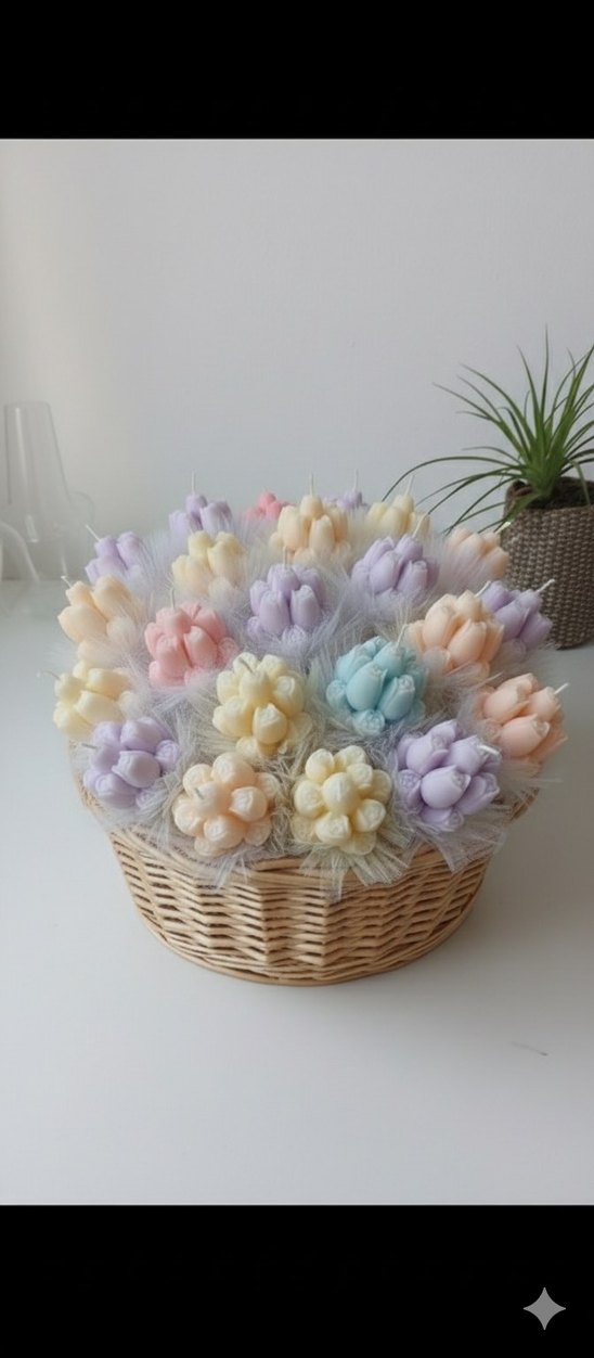 Pastel mor, pembe, mavi, sarı ve şeftali tonlarında çiçek şeklinde.Her mum özenle açan çiçek görünümünde yapılmıştır. ️Bir adet fiyatıdır istenilen renk için mesaj atınız