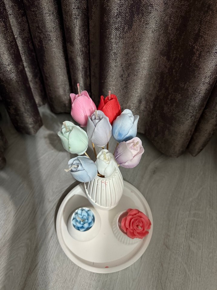 Pastel renklerde çiçek şeklinde mumlar beyaz vazoda ve yuvarlak tepside iki ayrı mum ile birlikte sunulur.