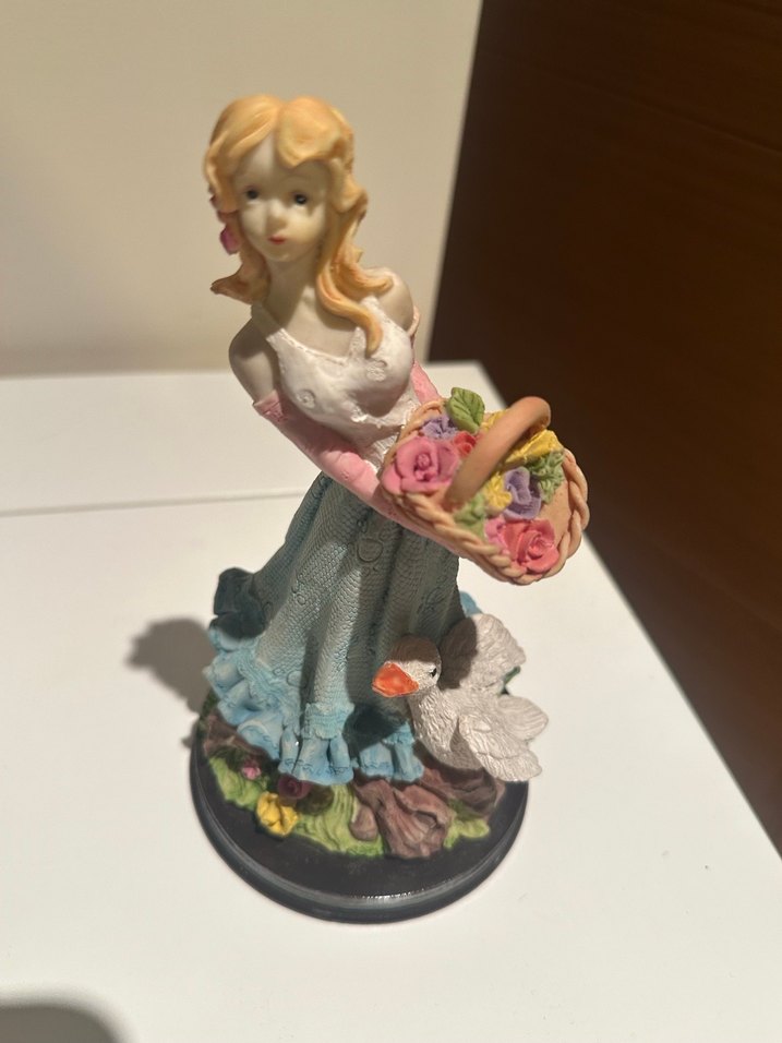 Pastel renklerde, çiçek sepeti taşıyan kadın figürü. Mavi etek ve beyaz üst giysiyle, çiçekli taban üzerinde duruyor.