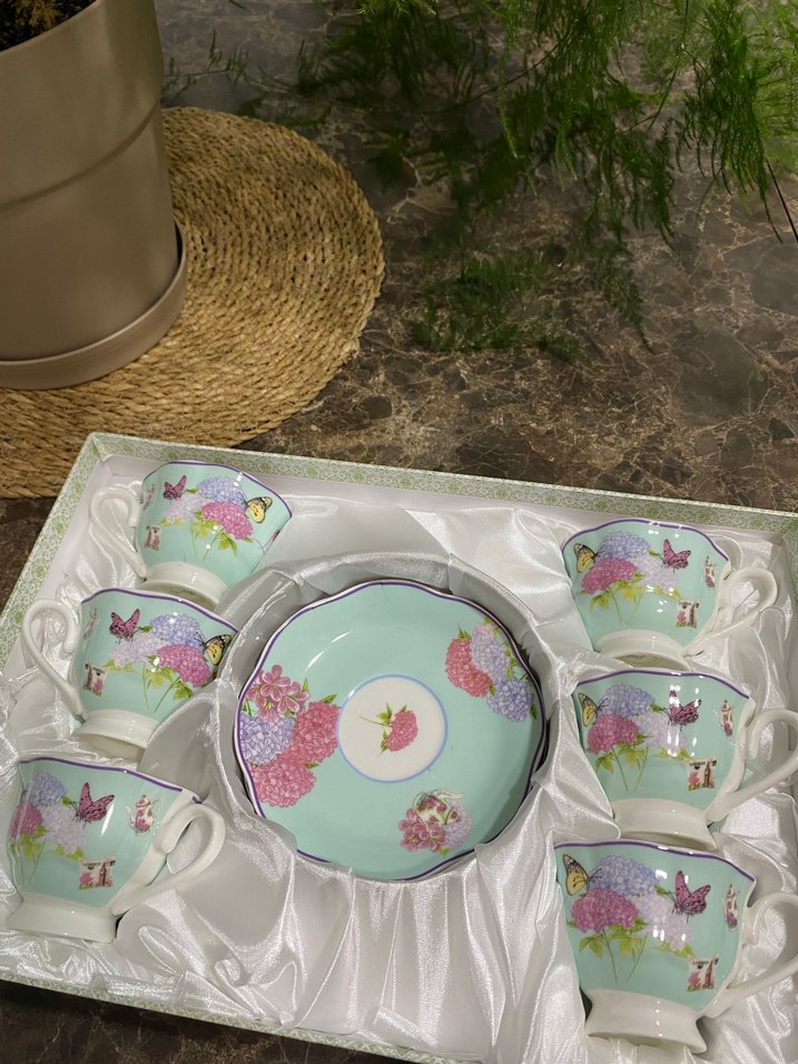 Pastel Renkli Çiçek ve Kelebekli Porselen Fincan Takımı