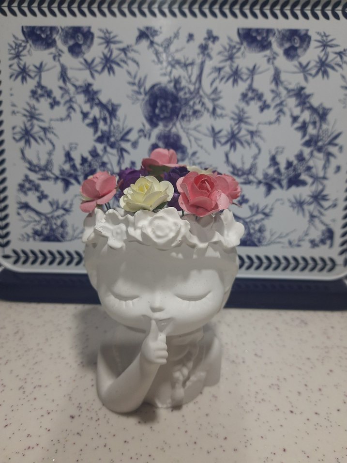 Pastel renkli çiçeklerle süslenmiş beyaz figürin, parmağını dudağına götürmüş sakin bir ifadeye sahip. ürünlerimiz el emegi olup tamamen taş tozu ile uretilmistir