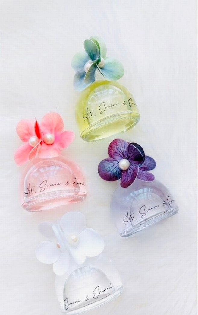 Pastel renklerde, çok renkli çiçek kapaklı şık hediye şişeleri. Toplu sipariş alınır tercihe göre inci tozlu kolonya kullanılır