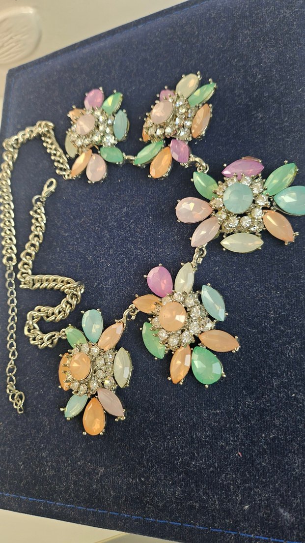 Pastel renkli, çiçek desenli ve payet detaylı kısa bohem tarzda parti kolyesi.