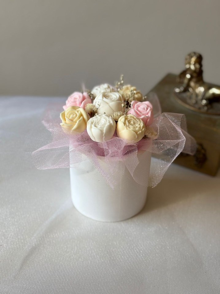 Beyaz sabun, pastel renkli çiçekler ve pembe tül ile süslenmiş, zarif bir dekoratif ürün. ️