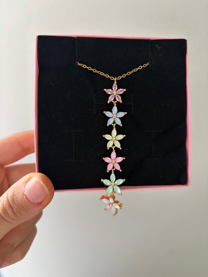 Pastel renkte, çok renkli çiçek detaylı zincir kolye. Bohem tarzı, günlük kullanım için uygun, midi uzunlukta şık bir aksesuar.