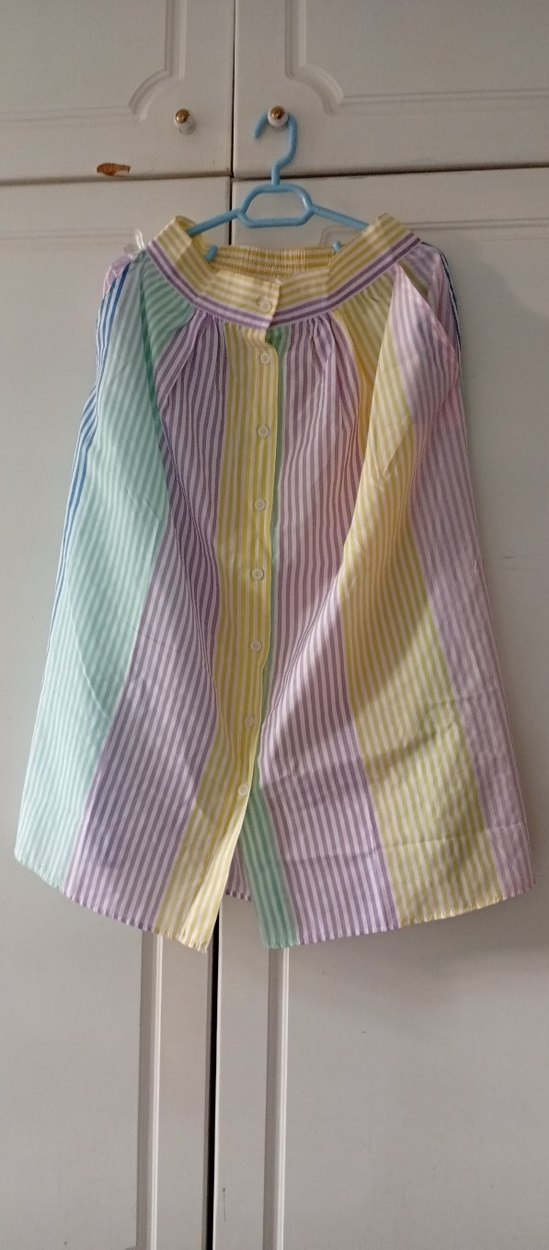 Pastel renklerde çizgili, pamuklu, pileli ve düğmeli, bol kesim hamile midi etek.