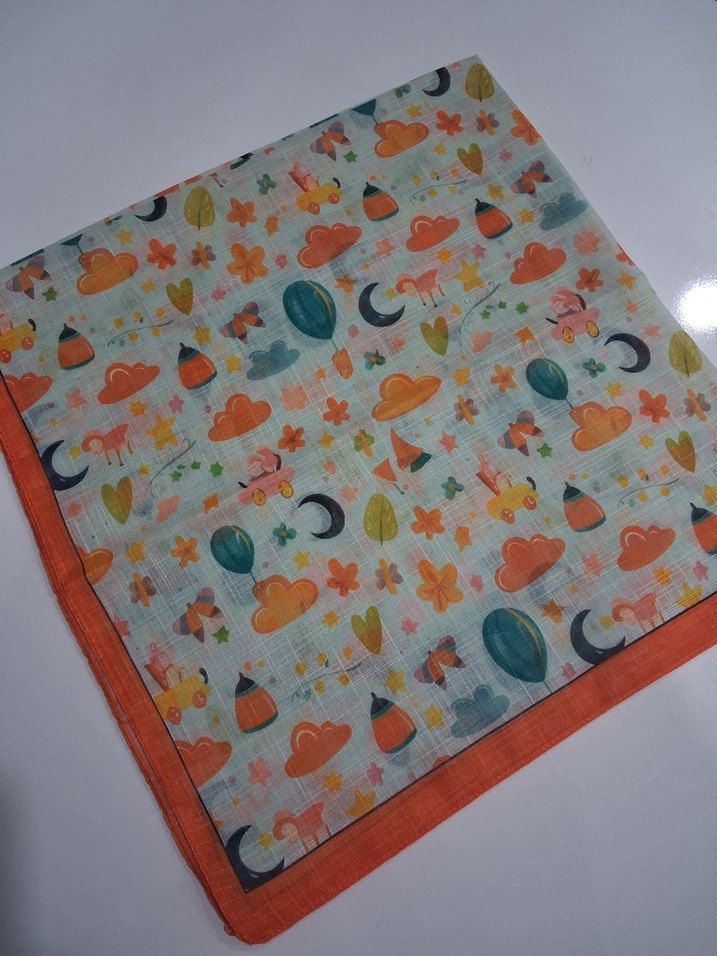Pastel renkli bulut, balon ve yıldız desenli çocuk başörtüsü. Yumuşak kumaştan olup turuncu kenarlıklıdır.