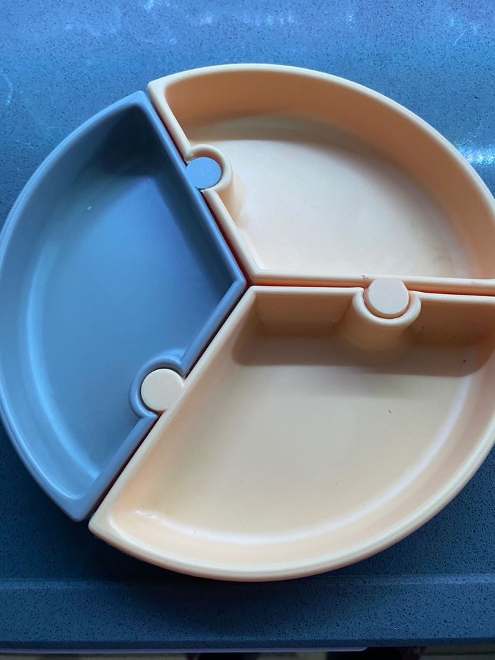 Pastel renklerde, üç bölmeli çocuk tabağıdır. Yumuşak mavi ve şeftali tonlarında, çocuk yemekleri için uygundur. Vakumludur