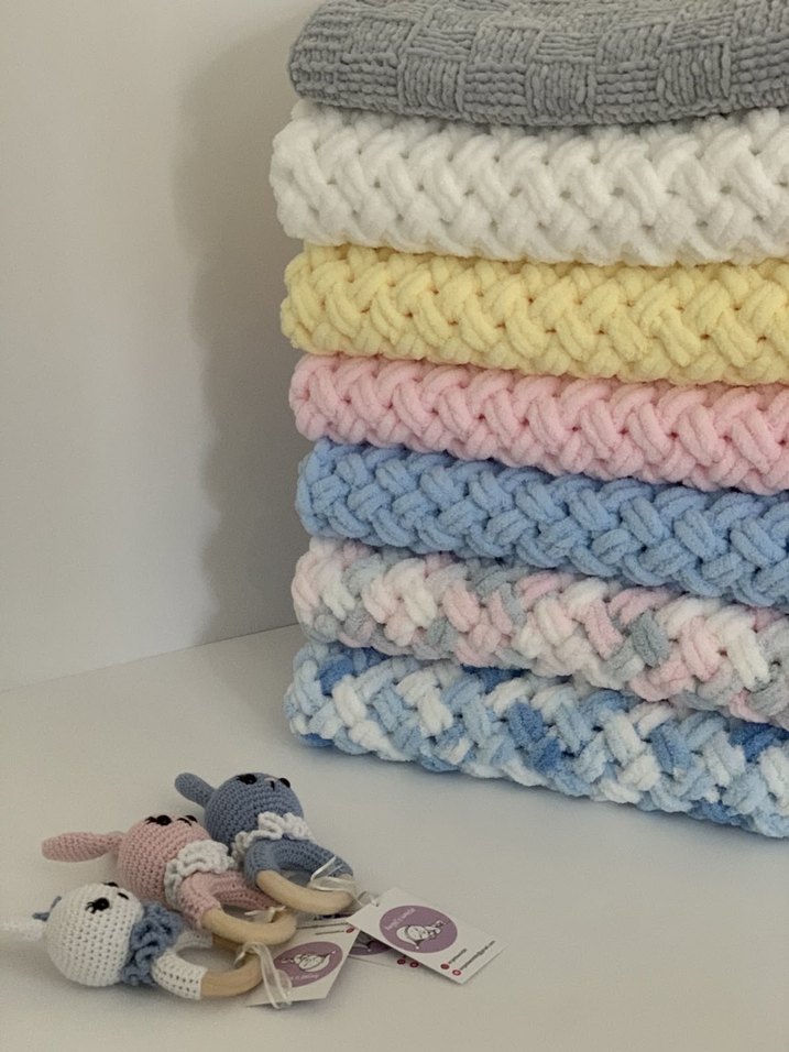 Pastel renklerde, örgü kumaştan üretilmiş, desen içermeyen çok renkli çocuk battaniyesi. Yumuşak ve rahat bir dokunuş sağlar.