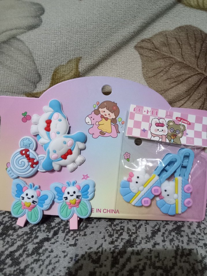 Pastel renklerde, baskılı desenli çocuk saç tokaları ve klipsler. Cırt cırtlı kapama ve rock punk tarzı figürler içerir.