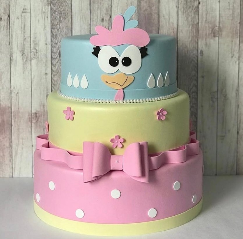 Pastel renklerde üç katlı çocuk temalı pasta, üst katta çizgi film kuş figürü, pembe fiyonk ve çiçek detaylarıyla süslenmiştir .