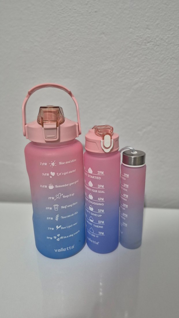 Pastel pembe ve mavi renklerde, saat işaretli üçlü çocuk termos seti. Her şişede güvenli kapak ve taşıma kulpu bulunur.