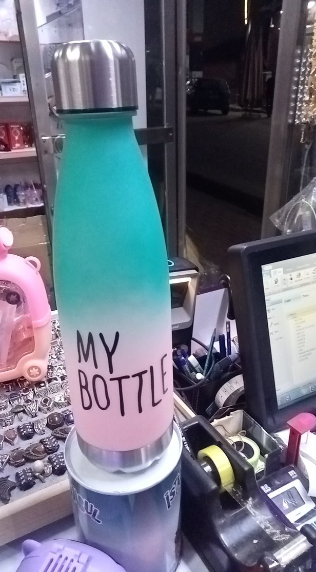 Pastel tonlarda, mavi ve pembe geçişli, 'MY BOTTLE' yazılı çok amaçlı su şişesi. Metal kapaklı, kullanımı ve taşınması kolaydır.