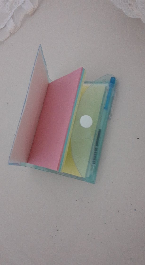 Pastel tonlarda çok renkli sayfalara ve kalemlikli şeffaf kapağa sahip not defteri.