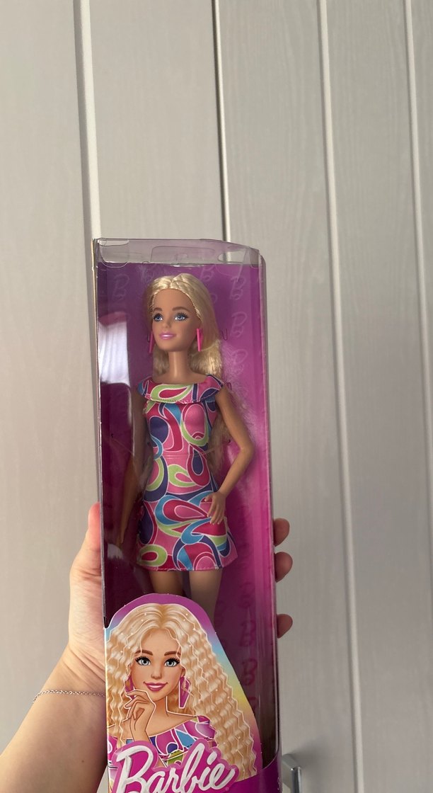 SIFIR ÜRÜNDÜR KUTUSU AÇILMADI Bu bebek, pastel çok renkli ve canlı desenli bir elbiseye sahip. Sarı saçlı ve mor kutuda paketlenmiş.