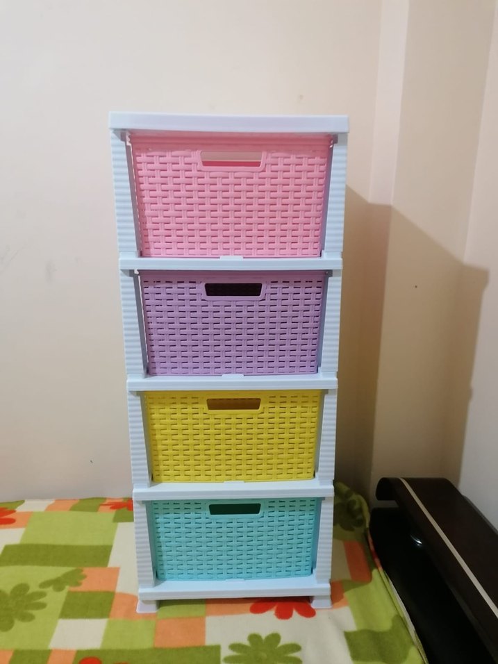 Beyaz çerçevede pembe, mor, sarı ve mavi pastel renkli dört çekmeceli dolap düzenleyici. Renkli ve kullanışlı saklama sağlar. Hiç kullanılmadı tertemiz ve sağlam ürün. Çocuk odası, banyo, mutfak, kiler vb alanlarda depolama alanı olarak kullanılabilir.