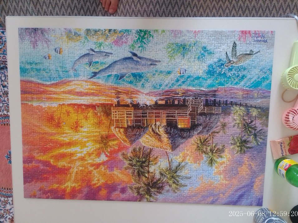 Pastel renklerde, yunus, kabin ve palmiye ağaçları içeren detaylı ve sakinleştirici bir manzara puzzle'ı. Eksik parçası yoktur kutusu ile birlikte durmaktadır.