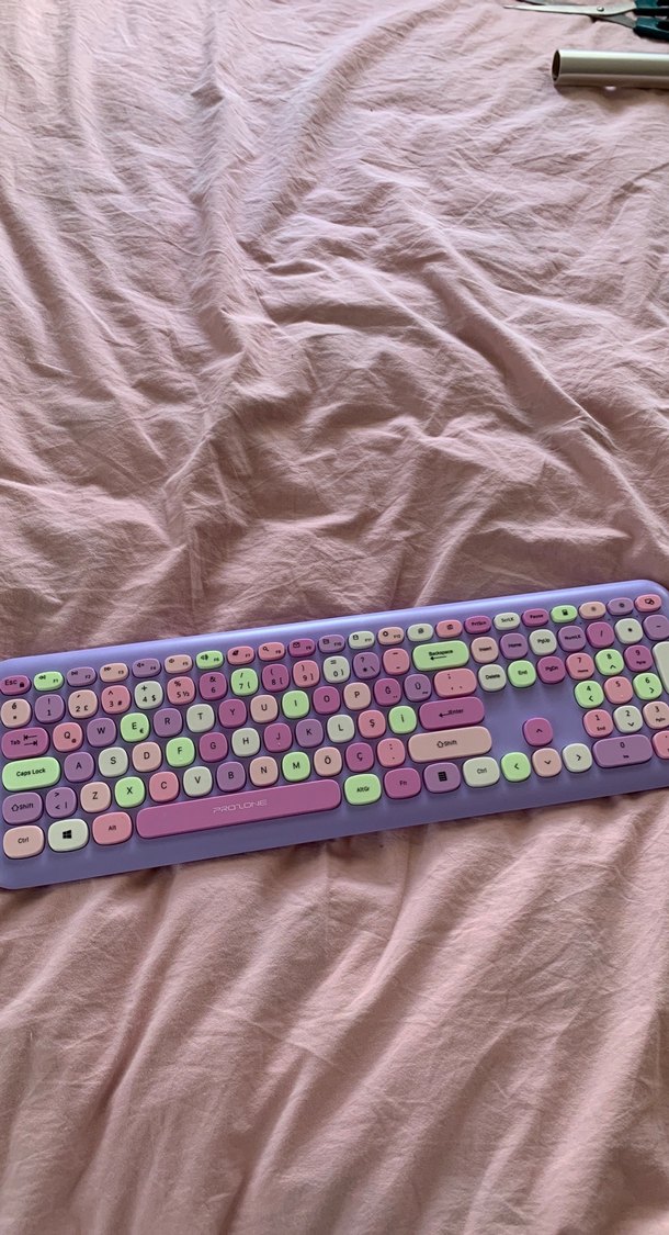 Pastel renklerde, çok renkli yuvarlak tuşlara sahip mor tabanlı klavye. Hiç kullanılmadı