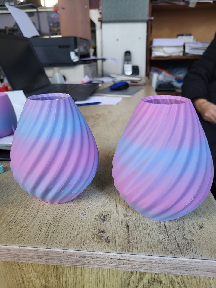 Burada, yumuşak pastel tonlarda çok renkli dalgalı tasarıma sahip vazolar bulunmaktadır.