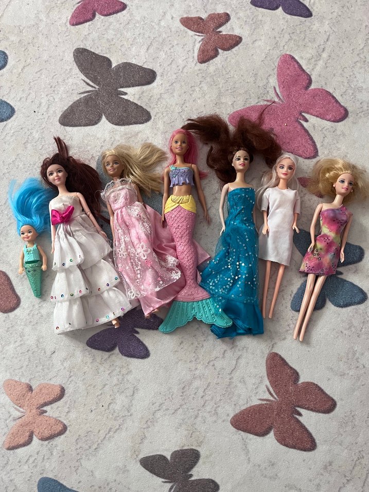 Pastel renklerde farklı kıyafetler giymiş çoklu bebek seti, denizkızı ve şık elbiseler dahil. Canlı saç renkleri ve detaylı kıyafetler içerir. Barbie bebekler kusurlu olabilirler o yüzden toplu fiyat bakamadım