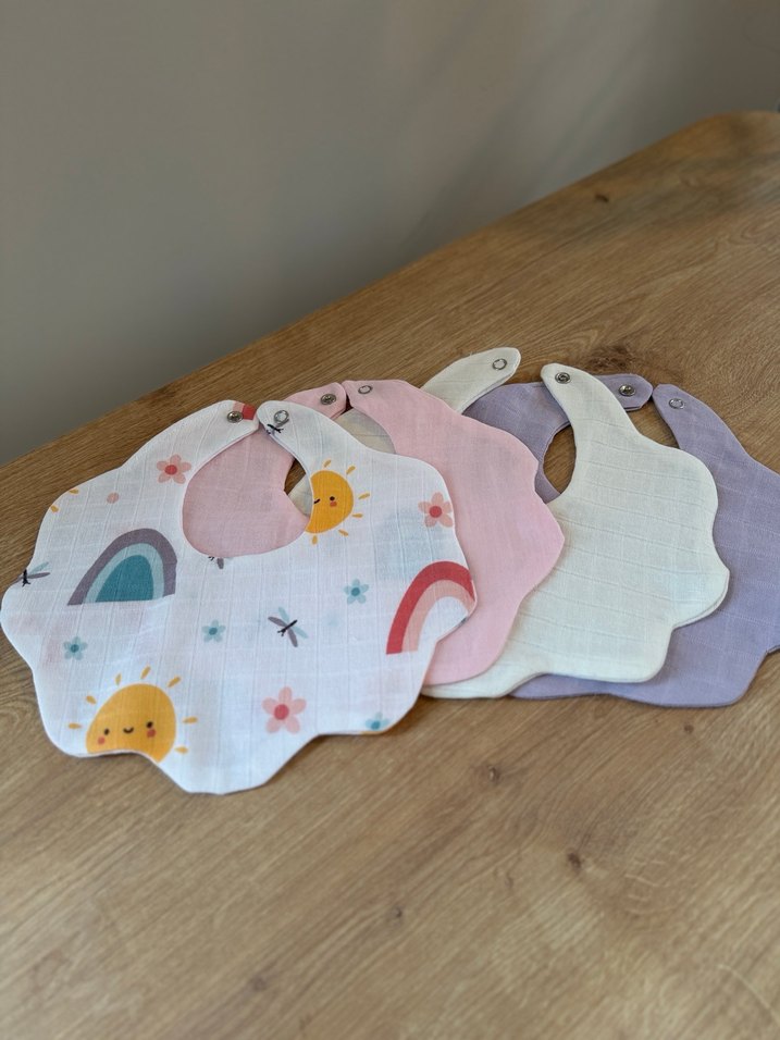 Pastel renklerde, gökkuşağı ve güneş desenli, yumuşak kumaştan yapılmış, çıtçıtlı bebek önlükleri.