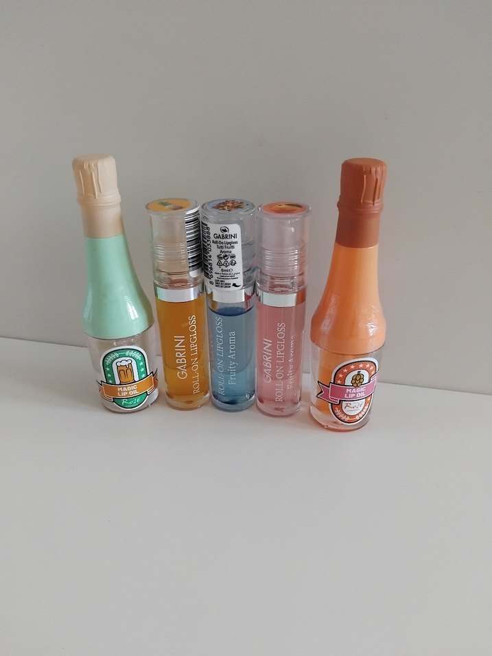 Yeşil, mavi, pembe ve turuncu gibi pastel tonlarda farklı şişe tasarımlarına sahip dudak parlatıcıları seti.