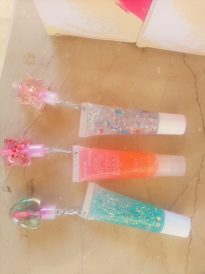 Pastel tonlarda, farklı renklerde üçlü dudak parlatıcısı seti, süslü kapaklar ve ışıltılı detaylar içerir.
