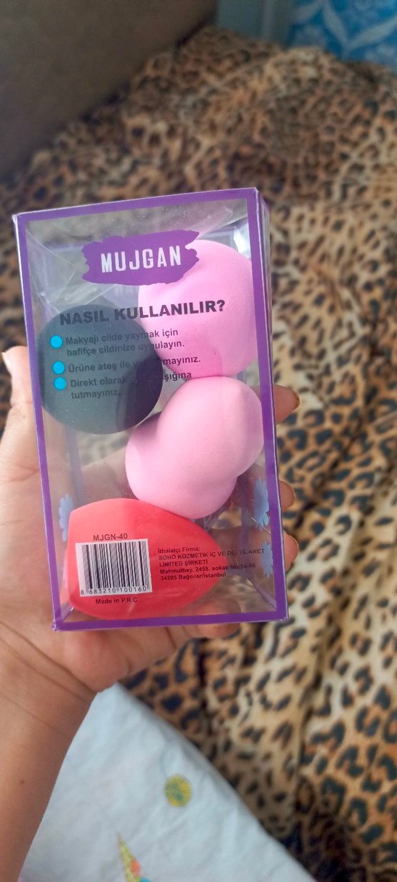 Pastel renklerde, farklı şekillerde çoklu makyaj süngeri seti. Ambalajında kullanım talimatları mevcuttur.