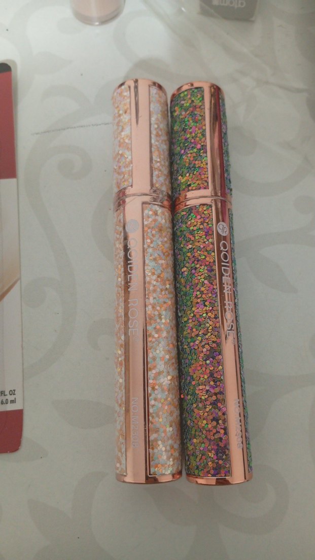 Pastel çoklu renklerde, simli detaylı iki maskara seti. Her tüp rose gold çerçeveli, şık tasarıma sahip.