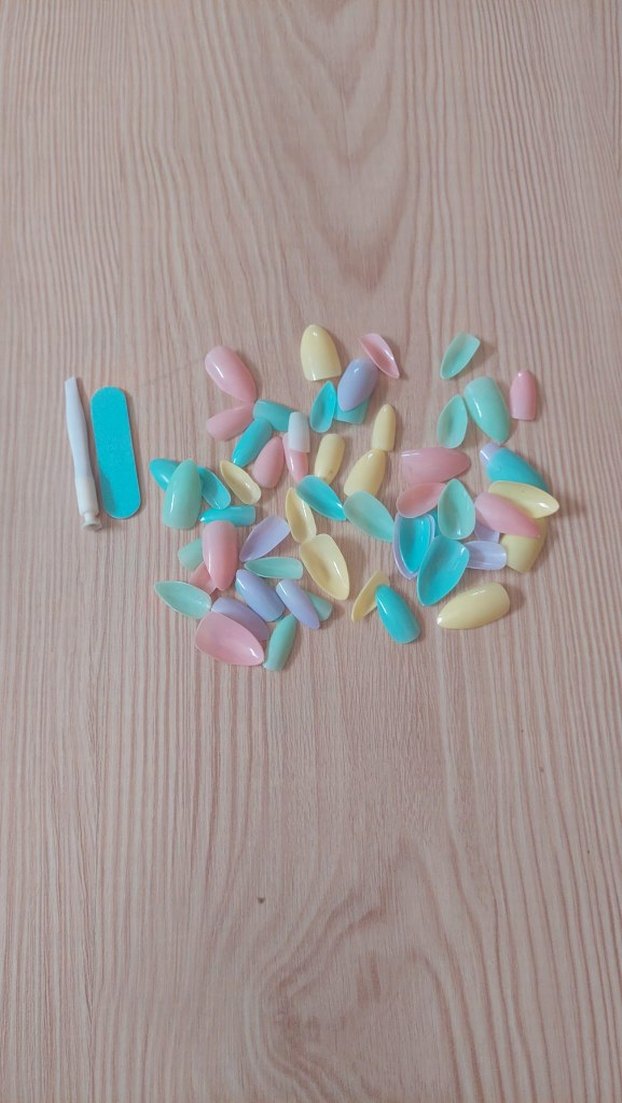 Pembe, sarı, mavi ve yeşil pastel tonlarda çoklu tırnak, yanında törpü ve çubuk ile birlikte.
