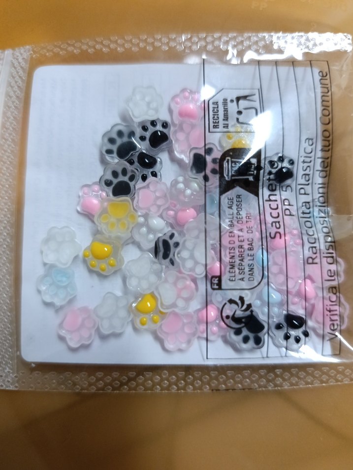 Pastel tonlarda, çok renkli pati izleri şeklinde tırnak dekorlarıdır. Pembe, sarı, siyah ve beyaz renkler içerir. 50 adet karışık renk kedi Patisi tırnak süsü ,protez tırnak uygulaması içinde kullanılır, yaratıcı sanat uygulamaları içinde kullanılabilir.( ürünleri tek olarak satın alın)