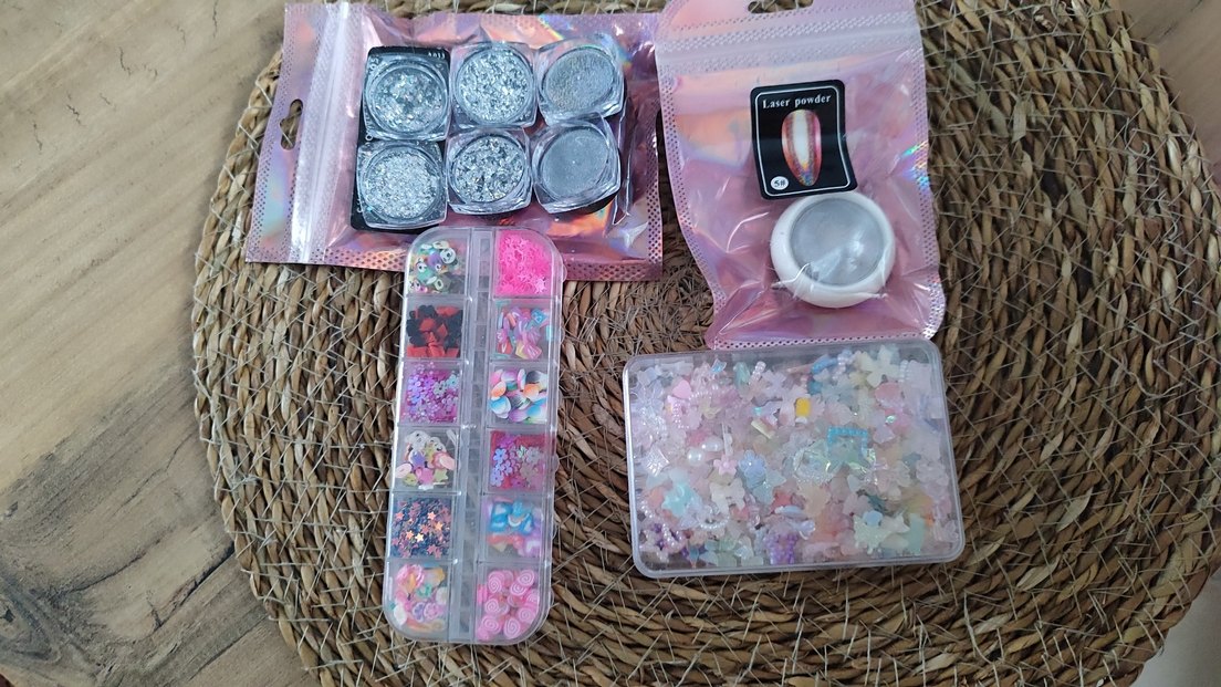 Pastel renklerde çoklu şekilli tırnak süslemeleri ve gümüş sim tozları içeren set. çoğu açılmadı