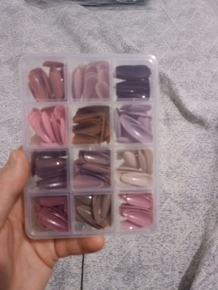 Pastel tonlarda çeşitli renklerde tırnak süsleri, plastik kutuda düzenli şekilde sunulmuştur. Zarif tırnak tasarımları için uygundur.