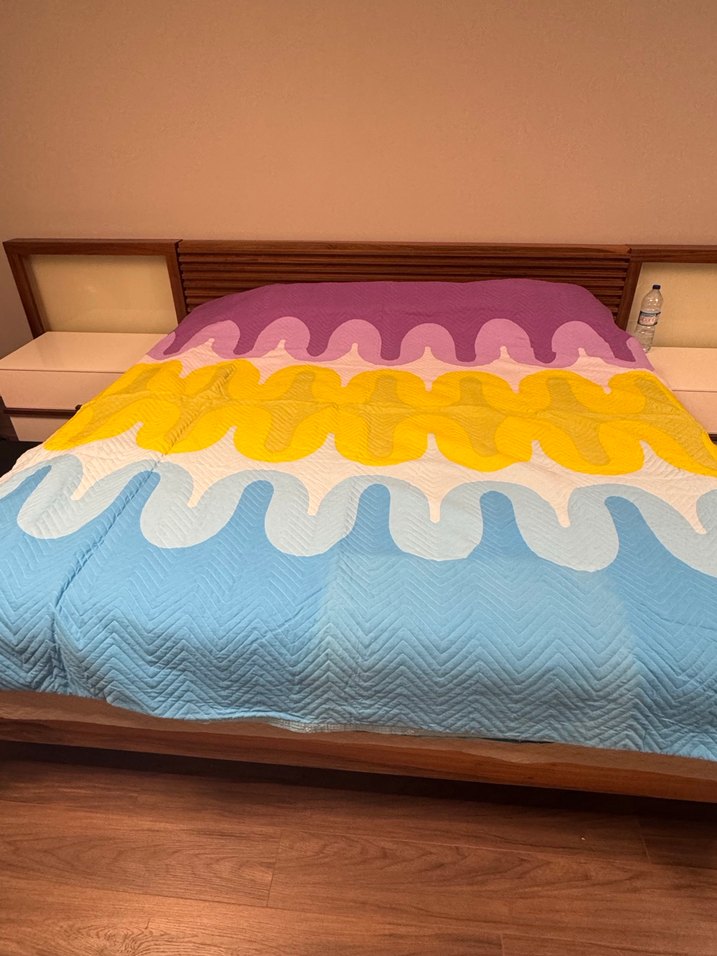 Pastel çok renkli dalga desenli yatak örtüsü, yumuşak ve canlı bir görünüm sunar.