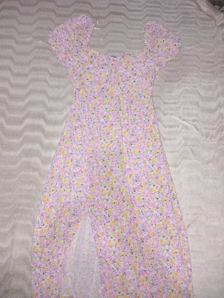 Pastel renklerde, kısa kollu ve tekne yaka uzun elbise. Sentetik kumaştan, dantel detaylı ve bohem tarzda, vücuda oturan kesimle.