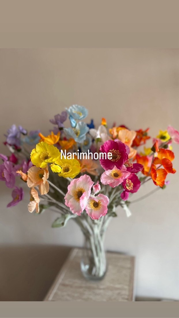 Narimhome imzalı, pastel renklerde çeşitli canlı çiçeklerin yer aldığı dekoratif aranjman.