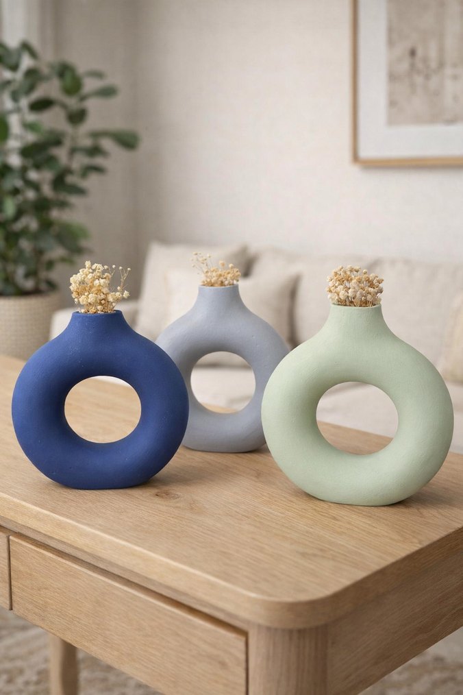 Mavi, gri ve yeşil pastel renklerde, modern yuvarlak tasarıma sahip dekoratif vazolar. Kuru çiçekler için uygundur. çiçekler fiyata dahil değildir