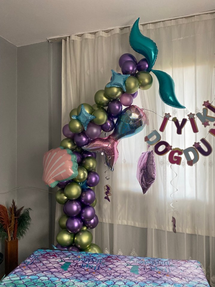 Pastel renklerde deniz kızı kuyruğu, yıldız ve deniz kabuğu şekillerinde balonlardan oluşan parti süslemesi. hepsi satılık istediğiniz ürünü söyleyip fiyat vermeniz yeterli yardmcı olcağım