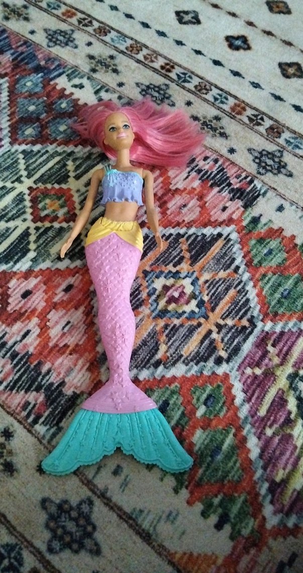Pastel renklerde çok renkli saçlı, mor üst ve pul desenli turkuaz kuyruklu deniz kızı bebeği. ♀️