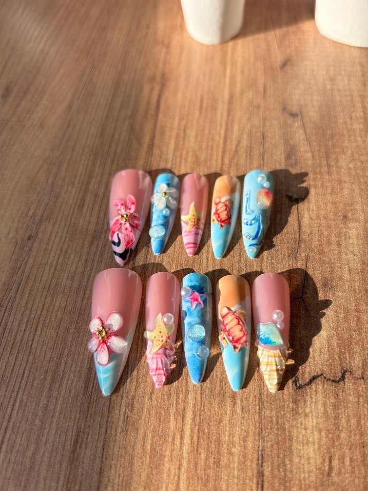 Deniz temalı deniz yıldızı, deniz kabuğu ve incili detaylara sahip pastel renkli tırnak seti. Canlı bir deniz esintisi için ideal.