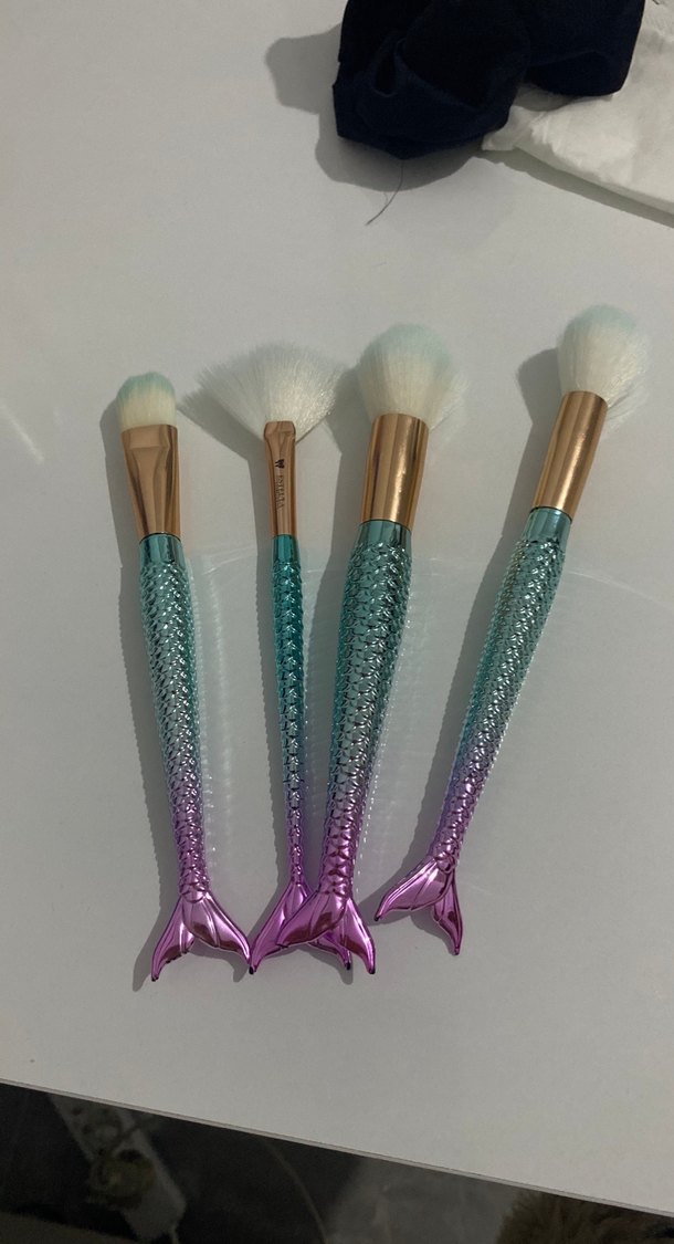 Pastel renklerde, denizkızı kuyruğu şeklinde saplara sahip, yumuşak beyaz kıllı makyaj fırçası seti.