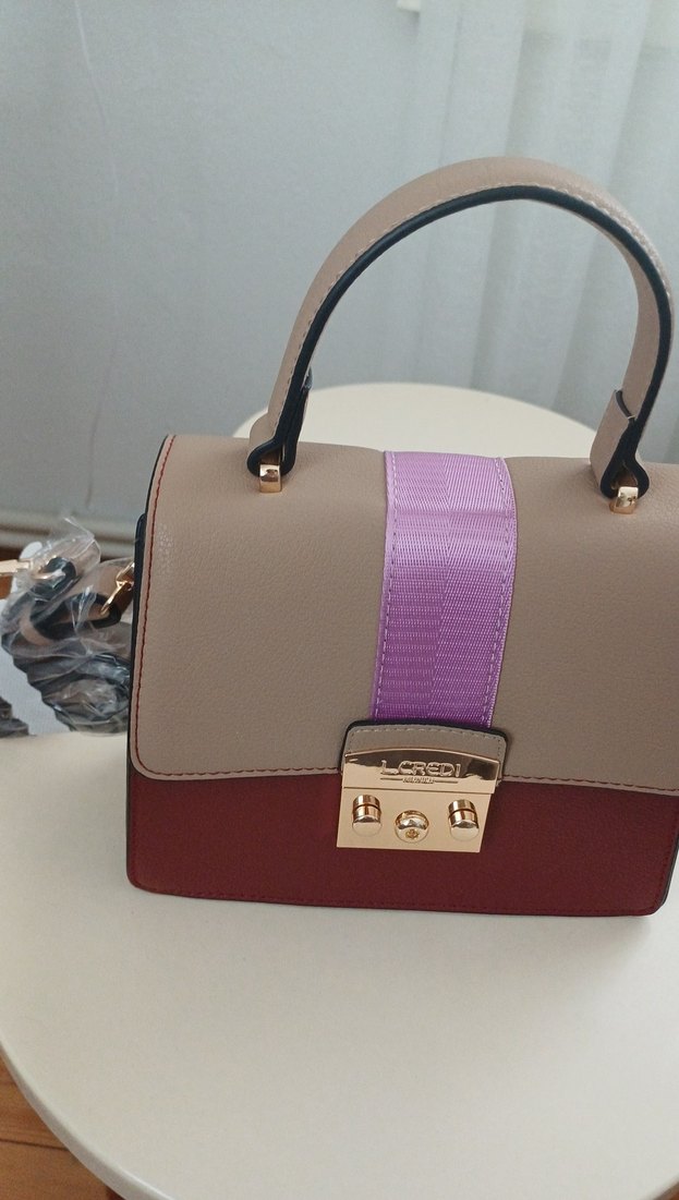 Kahverengi pastel deri kadın çanta, tokalı kapama ve baskılı desenle. Günlük kullanıma uygun, çağdaş tarzda, saplı.